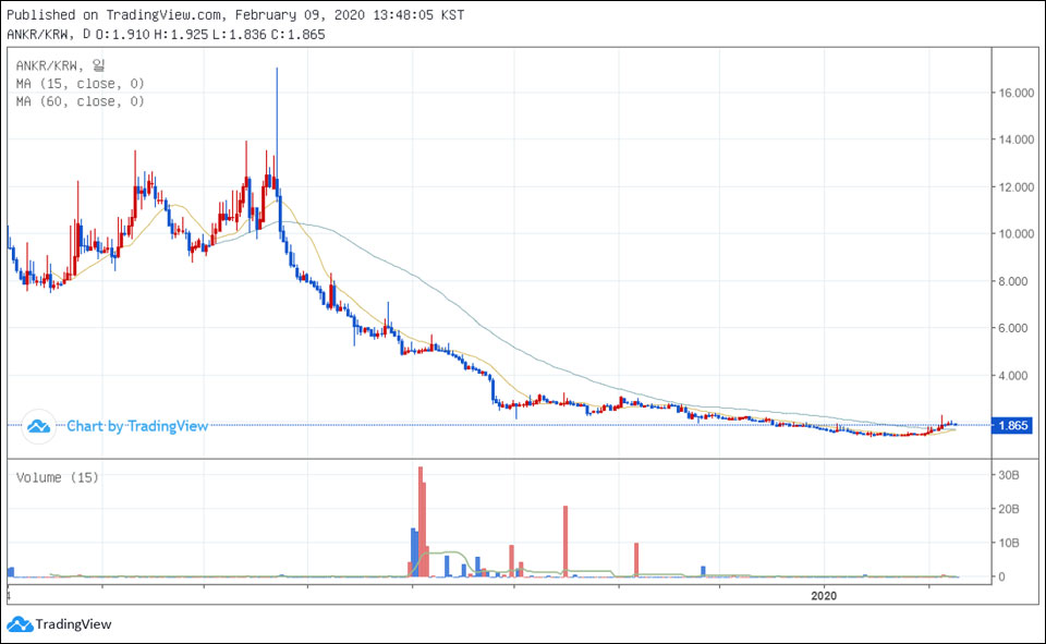 또 앵커는 2019년 5월 3일에 입성, 블록체인을 이용하여 분산형 클라우드 컴퓨팅 플랫폼을 구축하고자 하는 프로젝트다. Bilaxy와 MXC의 테더마켓(USDT)이 전체 거래량 37%로 방어선을 구축하고 있지만, 스트라티스와 마찬가지로 원화 마켓은 성적은 신통치 않다.