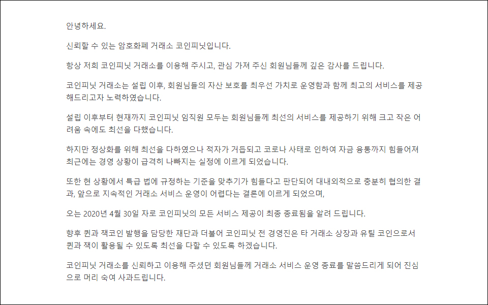 코인피닛 관계자는 "정상화를 위해 최선을 다했으나 적자가 거듭되고 코로나 사태로 인하여 자금 융통까지 힘들어져 최근에는 경영 상황이 급격히 나빠지는 실정에 이르게 됐다"며 "현 상황에서 특금법에 규정하는 기준을 맞추기가 힘들다고 판단돼 대내외적으로 충분히 협의한 결과, 앞으로 지속적인 거래소 서비스 운영이 어렵다는 결론에 이르게 됐다"고 말했다.