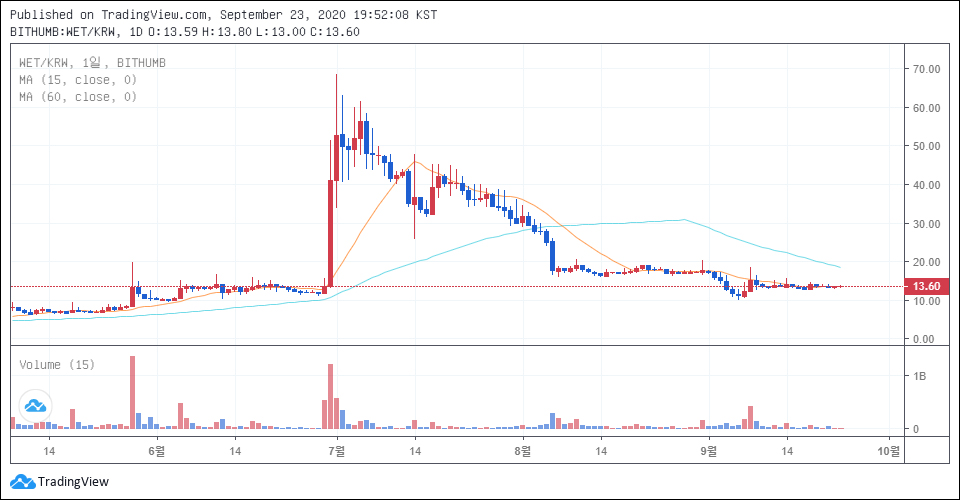 총발행량 12억5000만 개 중 약 37%에 해당하는 4억6385만1903개를 유통, 60%의 물량으로 가격 상향을 노릴 수밖에 없는 상황이다. 문제는 투자 수익률(ROI)이 -84%로 빗썸 상장 당시 58원으로 시작해 2년을 바라보는 시점에 1개당 13원꼴이다.
