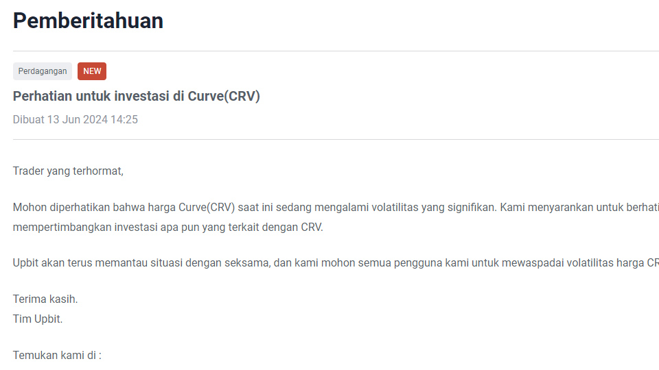 13일 업비트 APAC에 따르면 업비트 인도네시아와 업비트 태국은 커브의 투자 유의 의견을 냈다. 통상적으로 업비트 APAC은 업비트와 오더북을 공유해 거래와 투자 유의, 에어드랍, 상장 등 관련 이슈를 동기화하지만, 이번 경우는 달랐다.