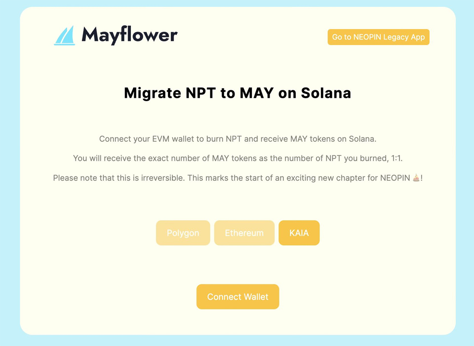 카이아(KAIA, 옛 클레이튼)에서 솔라나(SOL)로 터전을 바꾸면서 네오핀 대신 메이플라워(MAY)로 이름까지 바꾼다. 이른바 타이탄 프로젝트의 일환으로 메인넷과 터전, 네오핀 1개를 메이플라워 1개로 바꾸는 스왑까지 준비하는 등 속칭 판갈이에 나선 프로젝트다.