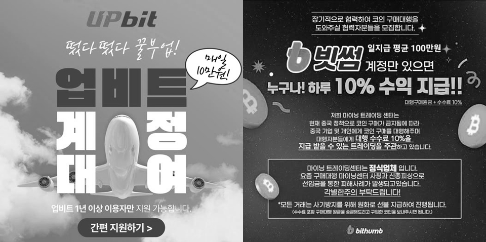 업비트의 계정 대여와 빗썸의 코인 구매 대행 등을 미끼로 고액 아르바이트가 텔레그램을 중심으로 다시 기승을 부리고 있다. 이전부터 거래소를 이용한 비정상적인 행태가 있었지만, 최근 들어 내외경제TV의 제보를 통해 다수의 피해 사례가 공유되고 있어 주의가 필요하다.