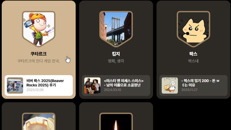 쿠타르크(송한상)이 운영하는 네이버 블로그 '쿠타르크의 인디 게임 천국'이 자두가좋아, 팍스, 사분의일 등 블로거 등과 함께 콘텐츠·게임 부문에서 2025년 올해의 네이버 블로그 100인에 선정됐다.