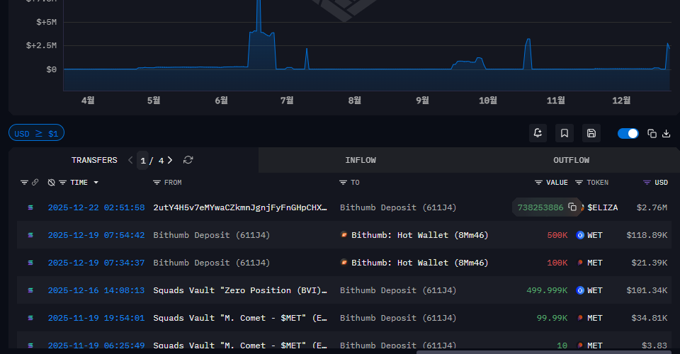 솔스캔에 611J4HQBM1ApG2ew3WJd8QDG8EtnLPymwF7mo16gkRho로 표기된 지갑의 이름은 아캄에서 Bithumb Deposit이라는 이름표가 부여됐다. 빗썸 핫월렛에 엘리자랩스를 전송할 수 있는 주체는 재단 뿐이며, 솔스캔에서 재단이 보유한 지갑 주소로 표식을 남겨뒀다.