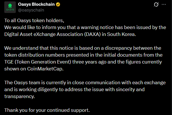 19일 오아시스 재단에 따르면 2023년 공개된 토큰 분배 비율에 명시된 유통량과 현시점(2026년 1월 기준)이 다르다고 이해했다.